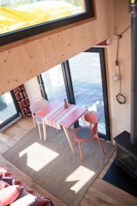 Die Unterkunft verfügt über ein separates Schlafzimmer, ein Wohnzimmer mit Kamin, eine voll ausgestattete Küche mit Kühlschrank und Herd sowie ein Badezimmer mit Dusche. Die Innenräume sind mit Parkett- oder Holzboden ausgelegt und verfügen über Heizung, Handtücher, Bettwäsche, ein Schlafsofa sowie einen Tisch mit Kochutensilien und Weingläsern. Den Gästen steht zudem ein Außenbereich mit Liegestühlen, Stühlen und einem Außentisch zur Verfügung.