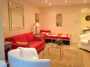 Das Apartment mit einem Schlafzimmer umfasst ein eigenes Badezimmer mit Dusche sowie eine voll ausgestattete Küche mit Geschirrspüler, Mikrowelle, Toaster und Kochnische sowie einen Essbereich. Der Wohnbereich bietet Kabelfernsehen, Heizung, Sitzgelegenheiten am Kamin und Zugang zu einer Terrasse mit Blick auf den Garten.