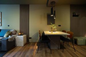 Each apartment features a seating area with a sofa bed, a flat-screen TV with streaming services, and a well-equipped kitchen including an oven, microwave, fridge, coffee machine, kettle, and dining area. Private bathrooms contain a hot tub, hair dryer, shampoo, soap, and linens are provided alongside hypoallergenic pillows. Rooms are heated and include fans.