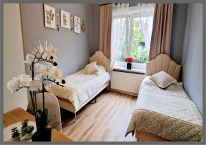 The accommodation features rooms suitable for families with amenities such as cribs and baby safety gates. Each room includes bed linen, towels, heating, a wardrobe or closet, kitchenware with refrigerator, facilities for making tea and coffee including an electric kettle, and access to a shared bathroom with shower and hairdryer. The shared kitchen adjoins the lounge area that opens onto the terrace. Guests can relax in the garden or on the sun terrace within the property grounds.
