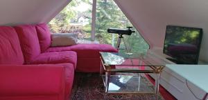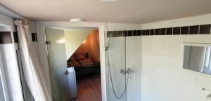 The apartment includes a bedroom with hardwood or parquet flooring, a kitchenette equipped with a dishwasher, oven, microwave, toaster, and an outdoor barbecue area. The bathroom features both a bathtub and shower. The living area has seating space and media equipment such as a flat-screen TV with pay-per-view channels and access to video-on-demand platforms.